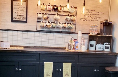 The main floor welcomes our guests to a common living room with a large screen TV and plenty of sitting room to meet with other guests, a half bathroom, a coffee bar, a breakfast area (breakfast is served daily from 8am until 10 am), and a mini bar for our guests to enjoy, board/card games, a highchair, and a full-service laundry room for our guests to facilitate during your stay.