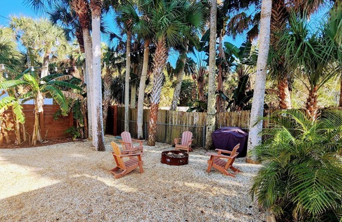 Kick back and relax in this beautiful, newly renovated cottage a block and a half from the beach! Enjoy sea breezes by the fire pit, a pina colada on one of the porches, or have fun playing outdoor ping pong under the string lights. Relax while grilling under the palm trees or try one of the specialty banana varieties growing right on site. The Golden Hour Cottage is the perfect place to escape it all. Located 1 mile from down town and only 2 to 3 blocks from popular restaurants.