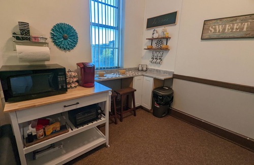 The home is on the second floor, 1 flight of stairs, and is equipped with a small kitchenette with refrigerator, sink, microwave, coffee maker and toaster oven. The kitchen overlooks the living room and features a pullout sleeper sectional and smart TV before entering the spacious bedroom with queen bed and a full bathroom.