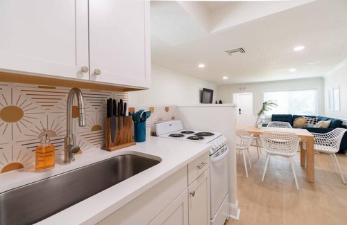 Unit 1, The Spanish House is 2BR/1BA condo with a full kitchen. A spacious living area and large dining table provides enough room for the whole family. This unit features a large sectional sofa, a comfy king size bed in bedroom 1 and two plush queen beds in bedroom 2, plus a tri fold mattress for use in the living area.