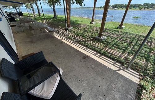 This large 640 Sqft Family Studio has double parking next to the entrance, and is next to RV spot 1. New Samsung TV with free Channels, streaming and Gaming. It has rear door which opens to the private covered patio and lake! The cabin includes 1 Queen & 1 full beds, kitchen with refrigerator, Microwave, dining table, full bathroom with shower, air conditioning. Dishes, utensils, towels, linens and pans. Private picnic table, additional portico, and your own BBQ. No charge for more people - just vehicles over 2 + or boat or trailer. This cabin is on the west end next to the boat ramp. Sunset View (4 night+ discount 5%)