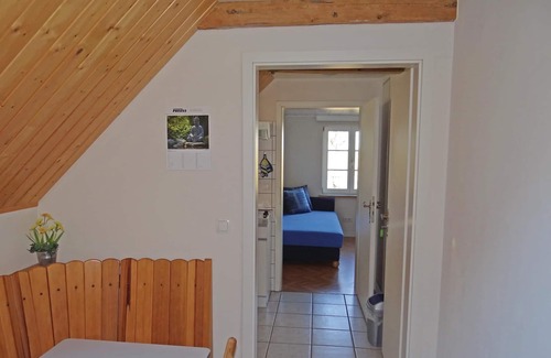 The manor house, built around 1800, was divided into several vacation apartments in the course of a complete renovation. After parking your car on the spacious property, the owners will lead you to your vacation apartment on the second floor with sloping ceilings. Besides two sleeping chambers, a floor-level shower bathroom and a kitchen, there is a living area with a dining table. If you like, you can also use the dining area with corner bench, chairs and small tables, located in front of your accommodation and shared with the guests of another vacation apartment. The large, shared property offers all units ample space for free play or quiet time and has a gazebo and open barbecue area a bit away from the house.