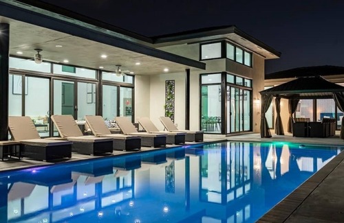 This spacious 8BR/7BA oasis at VILLA MANSION has it all. Inside: modern kitchen, game room, cozy living area, large TV, huge dining space, and pool table. Outside: BBQ terrace, lounging areas, pool with sun loungers, Jacuzzi, and fire pit. The perfect mix of relaxation and adventure—book now!