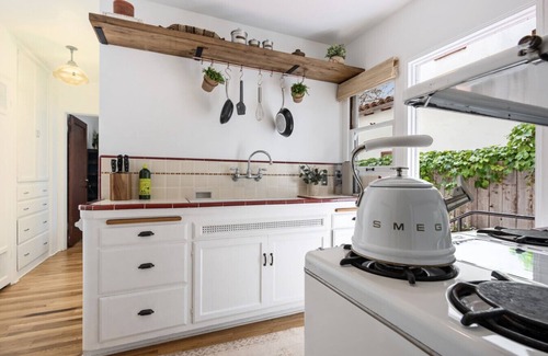 Tucked away in greenery, the Garden Suite is an airy hideaway in the heart of Santa Barbara. Surrounded by lush plants and featuring its own private garden patio and a front porch with a view of the Santa Ynez mountains, this serene retreat lets you enjoy California’s outdoor lifestyle in total tranquility . Despite feeling like a secret hideaway, it’s only steps from the ocean and a short walk to downtown Santa Barbara’s attractions – truly the best of both worlds. Inside, the Garden Suite charms you with a king-size bed, restored vintage furnishings, and even a working record player for a touch of nostalgic leisure (flip through our curated vinyl collection and savor the retro vibes) . The interior décor brings the outside in, with botanical accents and soft coastal colors, creating a calming space to relax and recharge. A full kitchen is provided so you can whip up breakfast to enjoy on the patio or chill local wine for an evening under the stars. Like all four of the Marlowe suites, you’ll have high-speed wireless internet and plush amenities, yet the Garden Suite’s magic lies in its peaceful, natural ambiance – your own little garden oasis by the beach. For honeymooners, nature lovers, or anyone seeking a rejuvenating escape, the Garden Suite offers a boutique Santa Barbara experience that is like a trip to Santa Brabara’s past.