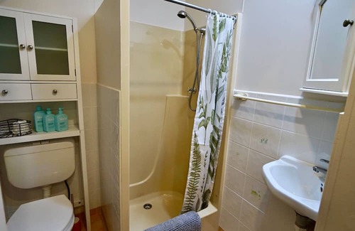 Main bathroom with a 1/2 bath with shower + vanity and seperate toilet.