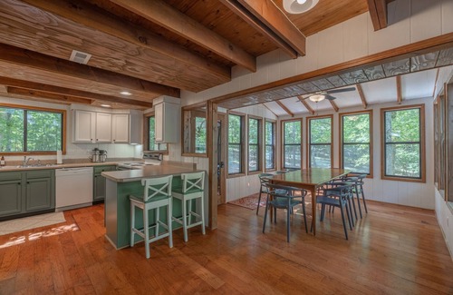 Once inside, guests are greeted with vaulted ceilings lined with cedar beams, a wall of elongated windows allowing natural light to seep through the interior, and walkout access to the expansive deck overlooking the woodland oasis below. Outfitted with a large fully equipped kitchen, open living area, dining room with panoramic views, and indoor and outdoor entertainment areas, your well-deserved private getaway is destined to create lasting memories!
