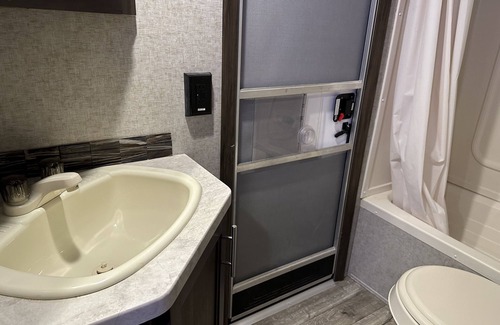 Come stay in a 2 bedroom, 1 bathroom newer camper that sleeps 5 - perfect for a quick weekend escape! Cozy living area with a fireplace and SmartTV. Outdoor picnic table and mini outdoor kitchen. Charcoal grill also onsite. Linens not provided.