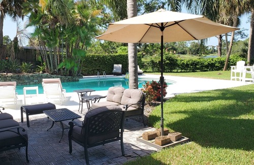 The large kitchen, dining and living areas all lead onto a magnificent south facing oversize pool terrace where there are numerous seating areas and dining areas; plenty of room for family and friends to gather. You'll find lots of areas to curl up to read a book while enjoying the Florida breezes, or lounge pool side on comfortable sun loungers to soak up the Florida sunshine.