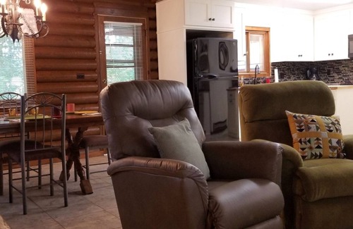 The cabin features an open-concept kitchen, dining, and living room. The kitchen is fully equipped with a 12-cup coffeemaker, toaster, refrigerator/freezer, microwave and electric range, but no dishwasher (requiring one to go back to the good old days!) The dining room features a unique castle-looking chandelier above the table. Windows allow for viewing all sides of the yard. The living room stone fireplace features a glowing ambience from its electric log insert. Two comfy rocker/recliners, an old-fashioned wooden rocker, a cushioned pull-out love seat, and a unique quilted arm chair allow one to enjoy the feel of "sitting by the fire."