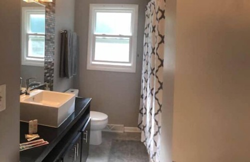 It has 1 bedroom, living room, dining room, and kitchen. The bath has a tub. Very comfy place, walking distance to strip mall and grocery. Easy access to the airport, Grand Rapids Downtown and outlet mall. Bike trail across the street.Also easy access to US-131 and M-6. Kitchen is equipped with all the essentials. Living room has a couch, read chair, smart TV, and a shelve with games for adults and children, plus books.