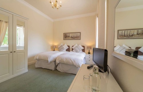This spacious twin room, located on the first floor, boasts relaxing neutral decor, providing a delightful view of the tranquil woodland area at the back. The space includes an entry hall, a family-sized ensuite bathroom equipped with a shower, and adaptable twin or double beds, complete with side tables and lamps. Additional amenities feature a spacious wardrobe, an armchair and a dressing table.