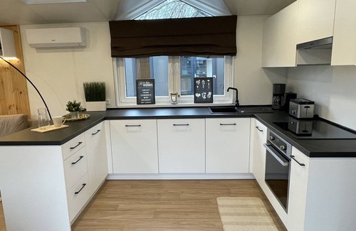 "Tiny Haus Altmühlpanorama", 3-room mobile home 48 m2. Comfortable furnishings: living/sleeping room with 1 double sofabed (160 cm, length 200 cm), Scandinavian wood stove (only for decoration), satellite TV and air conditioning. Exit to the terrace. 1 room with 1 french bed (160 cm, length 200 cm). 1 room with 2 beds (80 cm, length 200 cm). Open kitchen (oven, dishwasher, 4 ceramic glass hob hotplates, kettle, electric coffee machine). Shower, sep. WC. Small terrace. Terrace furniture. Facilities: washing machine, dryer. Parking at the house. Please note: non-smokers only.