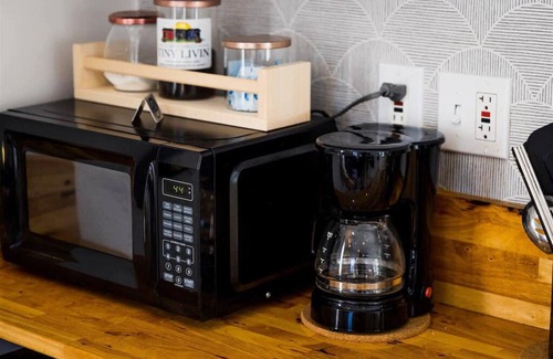 KITCHEN: Features microwave , plenty of counter space, a sink (no dishwasher), a mini fridge, coffeemaker. The kitchen is equipped with all the basics to cook a full meal, as well as 2 place settings. Coffee, creamer and sweeteners. A charcoal grill is also provided outside for guest use.
