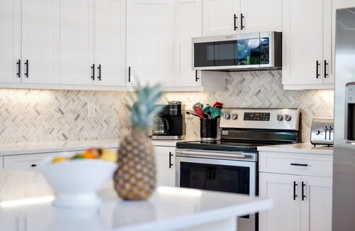 It is fully equipped with modern cooking appliances that make it suitable for preparing any meal, whether it is a simple breakfast, quick snack, or a three-course gourmet dinner. Spacious quartz countertops extend into a kitchen bar and provide plenty of room for you to work your master Chef magic.