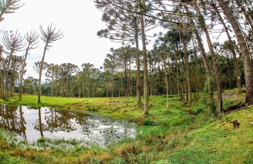 -Temos cesta e toalhas para piquenique, churrasqueira de chão e rede pendurada nas araucárias.