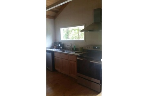 This is a studio cabin with a sleeper sofa and kitchenette. There is a small dining table and a separate bathroom (shower only). Linens are provided. It's important to note that this cabin is on a dirt road and has a gravel driveway.