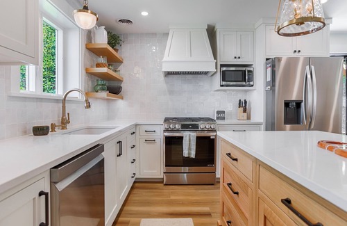Upstairs, you'll find three additional bedrooms and two full baths. The serene primary suite features a king bed and a private en-suite bathroom with dual vanities and a walk-in shower. A second king bedroom offers lake views, and the third bedroom is designed for flexibility with two twin beds (convertible to a king) plus a twin-over-queen bunk bed. The hall bathroom has a combo tub/shower and double vanity. Bath towels are provided; please bring your own beach towels.