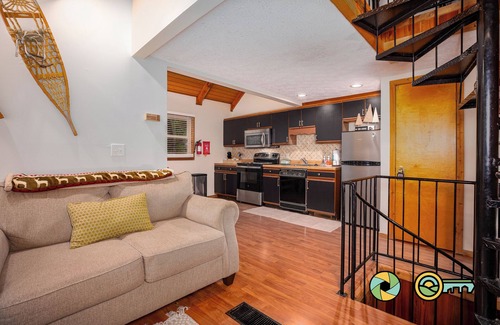 This property has a traditional kitchen and eat-in dining area that seats four adjacent to the living room. The living room features a fireplace (not operable), new furnishings, a Smart TV, and a sweeping vaulted ceiling up to the loft level. A super-cool iron spiral staircase connects all three levels. The main-level bedroom includes a queen bed and convenient access to the full bathroom, which also contains a stacked washer & dryer in the linen closet. The loft bedroom includes a twin bed and a twin trundle bed. This home comfortably accommodates up to five.