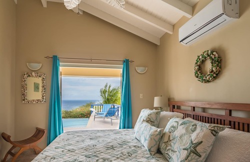 Ocean view villa, Dolphin House, is located on a hilltop overlooking the Carribbean Sea in a gated community close to more than 15 beaches. Sleeps 4 with 2 bedrooms and 2 baths. Your own private vanishing edge pool surrounded by a beautiful tropical garden and private covered lanai. Sliding glass doors open completely to reveal unobstructed views of the ocean and breathtaking sunsets. Cook outdoors on the gas grill, and enjoy your meal on the lanai. Ocean breezes blow through the nicely equipped eat-in kitchen and open living area with cozy furniture and entertainment center (TV, cable, DVD player). Large master suite with plush king size bed and French doors opening to the lanai, pool and views of the ocean. Guest bedroom has 2 twin size beds, which can easily become a king. The two baths have all the comforts of home. House has phone, AC (only in the bedrooms) high-speed internet and cable TV.