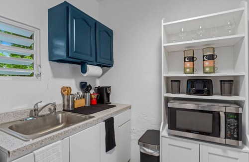 It includes a stove, refrigerator, microwave, coffee maker, blender, and all the cookware and utensils needed to prepare anything from a quick tropical breakfast to a gourmet dinner.