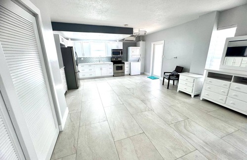 Gorgeous Turnkey Studio with Modern Finishes and Full Kitchen! Step into this beautifully updated, open-concept studio that perfectly combines functionality and coastal charm in The Upper Florida Keys next to Mariners Hospital. The space features sleek, oversized tile flooring throughout and is filled with natural light, creating a bright and airy atmosphere. A cozy sleeping area with a stylish white bed set offering Storage space while a spacious living area offers flexibility for relaxation or entertaining. The modern kitchen standouts with crisp white cabinetry, gleaming quartz countertops and a glass tile backsplash. Stainless steel appliances, Include a French-door refrigerator, microwave, e-range and oven, making meal prep a breeze. For added convenience, enjoy an in-unit washer and dryer with built in Cabinet, plus a Large and Spacious closet. This studio also includes a flat-screen TV, a comfy seating area, and ductless Mini- AC for year-round comfort. Assigned parking right in front of the unit for easy access after grocery shopping. Whether you’re looking for a vacation retreat, a temporary property, or a stylish minimalist home, this studio delivers on all fronts! Turnkey and ready to enjoy! Just bring your suitcase!