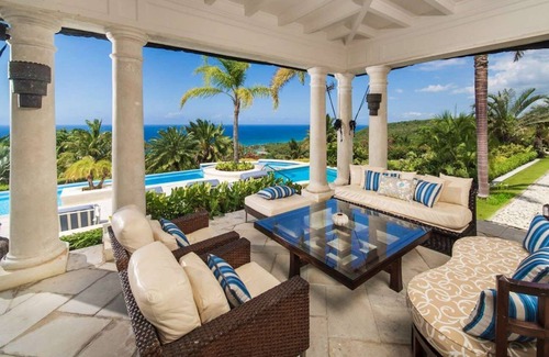 Surrounded by ten acres of rolling manicured lawns, Twin Palms commands views that take in sixty miles of the ocean. The house is built on one level and the Great House influence is punctuated with accents of Rome through the graceful columns and shaded courtyards and here and there, subtle hints of a Moroccan palace. There is a seamless flow to this house that enables the breeze to constantly waft through; lofty rooms enhance the sense of space; calming shades of blue, coral, and splashes of red create a restful and timeless ambiance and there is the distinct awareness of the outside being brought in from wherever you look.
