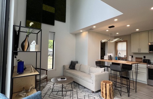 These brand newly built cottages features a fully equipped kitchens and cozy living spaces with vaulted open ceilings, 1 1/2 bath, a lofted master bedroom and small 2nd bedroom with trundle bed in each cottage. They includes a washer and dryer, deck furniture and grill, fire pit by the river, and 2 street parking spots per cottage. Small workspace with desk available in master bedroom.