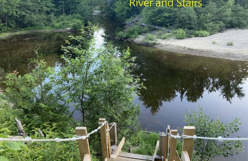 The views from our property are why we love this place. We offer TWO CABINS for up to to eight people on a park-like three acres overlooking a wild river with stunning mountain views. Guests who want to get closer to the water can access the river by a stairway built into the hill at the back of the property. Our cabins are built in the spirit of traditional Adirondack camps, it's about getting a feel for the outdoors, the air, the forest, the spaciousness of the Adirondack Park, sun, rain, mist, bugs and all. Our cabins are intentionally simple and compact by design, but comfortable and cozy. The property is located in a mixed use area of vacation and year round homes. The larger of our two cabins is about 900 square feet with a queen bed and a futon couch on the second level, and a double bed with a simple privacy curtain on the ground level. A futon couch which converts to a bed is in the living room to provide a fourth sleeping area if needed, The main cabin has a compact but well equipped kitchen. Kitchen amenities include an electric stove, microwave, toaster, fridge, pots, pans, utensils, dishes and glasses, etc. (we like to cook). A compact washer and drier is available for guests. There is WiFi internet, a smallish TV, books, DVDs, and games. Outside enough room to throw a football or play a lawn game. A wood stove is in the living room, and lots of firewood in the wood shed. The second smaller cabin is 400 square feet in total with one queen bed and an "Ikea" single pull out bed if needed. Both cabins have bathrooms with toilet, sink and shower. Both cabins have kitchens, but the small cabin kitchen is very basic, sink: sink, hot plate, toaster oven and small fridge. The location here is well situated as a base camp for all things Adirondack, hiking, swimming boating, snow shoeing, snowmobiling, etc. High Peaks trails begin in Keene Valley, a short drive to the north. The Village of Schroon Lake is a short drive south, they have a great public beach, or just stay put, cook a meal and enjoy the grounds and river. The property is located on a level, paved and maintained town road with other vacation and year round homes. The driveway on is long, flat and plowed in winter. This is a year round camp, but In many ways spring and winter are our favorite time to be here, in cold weather the river looks different every single day. And on a clear night, any time of the year, you can look up and see the milky way.