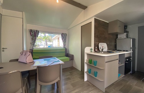 Treat yourself to a peaceful break at the Sous les Pins mobile home, nestled in a quiet, shaded cul-de-sac.