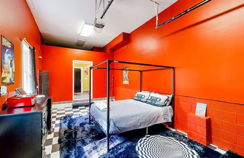The renovated garage-turned bedroom boasts an abundance of retro charm with its old-school movie posters, checkered flooring, and bright pops of color. The furnishings are soft and the temperature is always comfortable with central air-conditioning at your disposal. A separate bathroom with a stand-alone bathroom is available off the room. Washer/dryer access, a fireplace, a collection of board games, and internet round out the interior amenities.