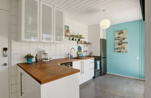 This tastefully updated one bedroom bungalow condo is located at the famous and storied Ocotillo Lodge, one time exclusive hangout of the glamorous stars of the '50s and '60s. While everything in the unit is mostly brand new, the modern aesthetic works perfectly with the architecture and the surrounding complex, which still retains its midcentury charm and Rat Pack swagger. Midcentury purists and design aficionados will love this option, as it provides the best of both worlds, with all the modern conveniences.