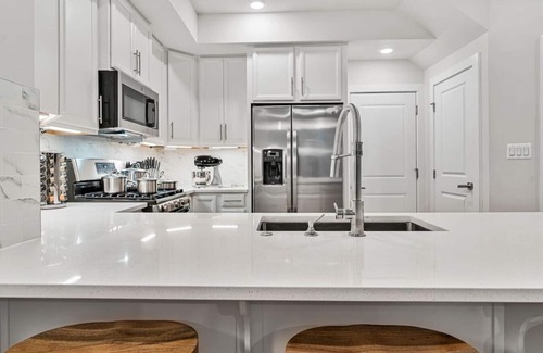 The main level features a welcoming mid-century modern design, gourmet kitchen with white cabinetry and quartz countertops. work station with adjustable standing/seated desk, and dining. Upstairs includes a master bedroom with the king-sized Soho Tufted Belgian Linen bed frame by Restoration Hardware and memory foam mattress. Two additional bedrooms include overstuffed queen-sized memory foam mattresses. One bedroom includes an attached balcony with outdoor seating. Enjoy 5-star amenities including brand new appliances, high-speed wireless Internet by Verizon Fios, three large screen televisions with wi-fi ready apps, Netflix, HBO, Amazon Prime and Disney+.