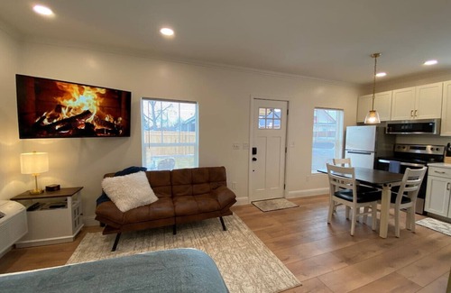 Everything in this unique cottage is brand new! The daylight floods in through the large front and side windows making the space cheery and bright. The kitchen is fully stocked to meet your cooking needs. The convertible futon adjusts to a twin-size bed. The full bathroom includes a heat fan to make your morning shower a more comfortable experience. Linens and toiletries are provided.