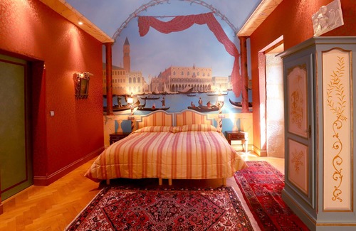 In the "Venise" apartment, the mural in the bedroom invites you to dream of being on the Grand Canal; to pen a letter about your adventures at the antique writing desk or to contemplate the impressive fountain and rows of vines on the opposite hillside.
