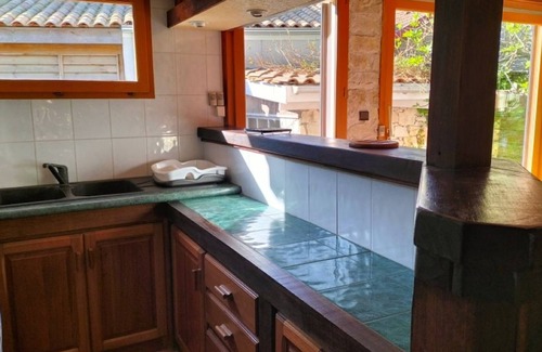 Kitchen area: Counter with bar sky separating the kitchen area from the living room: Gas stove, fridge, microwave oven, mini electric oven, extractor hood, dishwasher, coffee maker, sink, crockery and kitchen utensils, vanity unit storage, table, chairs. Window with electric roller shutter.