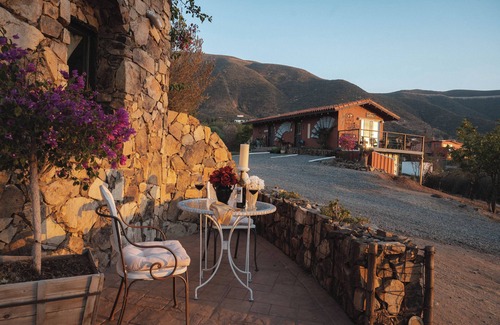 Quaint and private five suite Tuscan Hacienda and Vineyard style best describes this country house in "Ruta del Vino", Valle de Guadalupe. The property (as described by one of our guests) "where luxury meets country living" is "tucked away in the valley behind winding dirt roads so magical and peaceful". From the foothills you oversee gently rolling hills with San Antonio de las Minas in the background.