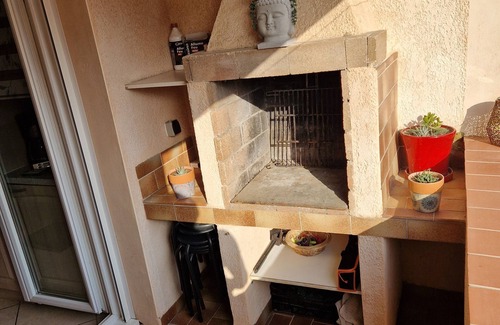 The veranda overlooks both a small fitted summer kitchen and a small tiled backyard (about 8 m²) surrounded by a small landscaped garden with flowers where table and chairs will allow you to take your meals outside.
