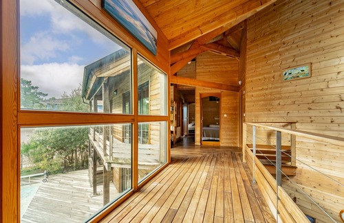 As soon as you walk through the front door, you will be enchanted by this bright and warm living space, built in the idea of a boat, all in wood, with its large glazed spaces which flood the villa with natural light, views overlooking the swimming pool and its large wooden terrace creating a welcoming and soothing atmosphere.