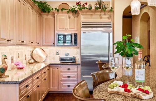 Three guest bedrooms have a king, and two queen beds and enjoy their own full bathroom with towel warming devices and soft, thick towels. We provide extra for ladies` hair! You won`t struggle for lack of towels. Wine Country Life Vacations supplies luxury and yet eco friendly soaps, shampoo, conditioner, body wash and lotion for our guests as well, and we offer grocery shopping, stocking should you wish a fully supplied kitchen upon arrival.