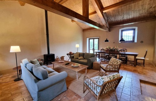 Kitchen with direct exit to the garden (equipped with oven, dishwasher, coffee machine, toaster, electric hotplate and grill, kettle, refrigerator with freezer), living room with large table for eating comfortably for 10 persons, modern wood stove.