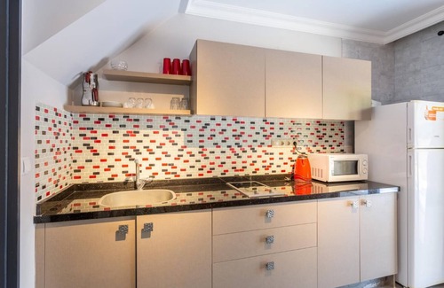 The kitchen is air-conditioned and features a washing machine,