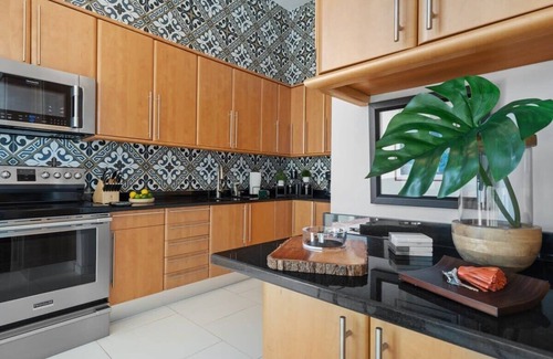 Villa Gaudi's kitchen was just updated with a spectacular Spanish tile "creole" style backsplash. In Puerto Rico, we say love enters your house right through the kitchen, so you and your group will surely spend time socializing and cooking in this beautiful space. There is a coffee maker, kettle, stovetop, toaster oven, microwave, and fridge. You’ll have enough paper towels, trash bags, and dish soap to comfortably start your stay. There is an amazing breakfast nook with a bistro-style table right beside the stunning floor-to-ceiling windows where guests can enjoy their breakfast while having partial views of Old San Juan.