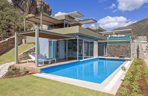 Layering itself down the side of a rocky cliff, the villa is cut into the landscape effortlessly embracing the elements of nature. Details, such as the big rock which has been turned into an element of the structure, or the small waterfall linking the property’s main pool with a plunge pool a level below, create a restful sanctuary of peace and serenity just a stone's throw from the beach. Meanwhile, the pool’s glass edge makes you feel as though the water flows right into the sea! Throughout the villa guests are encouraged to indulge in a joyful sense of harmony, which appeals to devotees of the Cretan spirit.