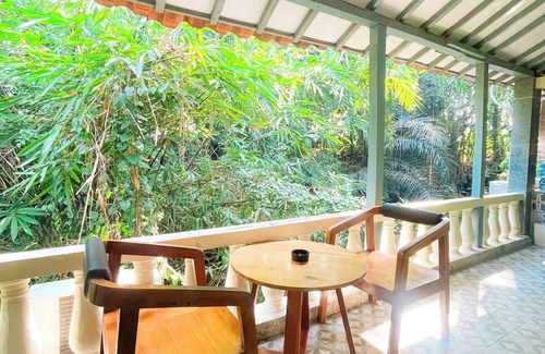 Suara gemericik aliran sungai dan pepohonan rimbun melengkapi keasrian suasana pedesaan yang tenang dan damai di sekitar villa.