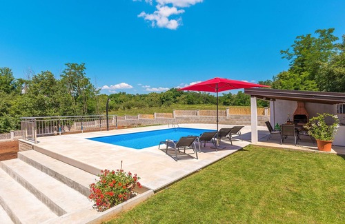 Single-family house "Villa Laura", 2 storeys. In the hamlet Prhati 5 km from the centre of Višnjan, 20 km from the centre of Poreč, 20 km from the sea. Private: property 800 m2 (fenced) with lawn, swimming pool (8 x 4 m, depth 150 cm, seasonal availability: 27.Mar. - 05.Nov.). Outdoor shower, terrace, garden furniture, barbecue, pool maintenance by the owner/gardener. In the house: internet access, washing machine. Motor access to the house (200 m via unmade road). Parking (for 2 cars) on the premises, single garage. Shop 5 km, bus stop 21 km, railway station 21 km, pebble beach 20 km. Please note: 1st floor is closed and not occupied.