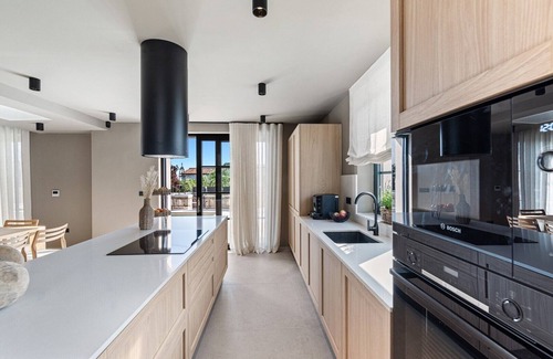 The first floor offers three luxuriously decorated ensuite bedrooms, each with its own bathroom and modern interior. On the second floor there is a main master bedroom with a private bathroom, as well as an elegant open-plan living room with a roof terrace, from which there is a beautiful view of the sea in the distance.