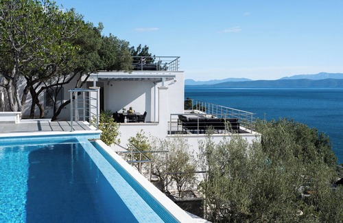 This elegant apartment occupies an entire floor of the beautiful Villa Pape and offers guests exclusive use of their own swimming pool, surrounded by lush Mediterranean greenery and endless sea views.