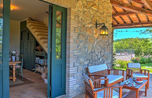 The country house is surrounded by a garden of 5000 square meters completely fenced. Olive, secular oak and numerous fruit trees including apple, plum and fig and the well kept green lawn create breathtaking scenery. The villa is almost completely surrounded by a porch directly accessible from the living room or the kitchen where you will find barbecue equipment and a table at your disposal for cooking and outdoor eating while admiring an astonishing view on the swimming pool and vineyards. The property is equipped with a parking area and a garage for a car-place.Please notice that photos are taken in spring, therefore flower blossoming, and the colours of the gardens' grass could be different at the moment of your arrival at the villa.