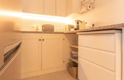 The kitchen is modern, with light-coloured furnishings, fully equipped including induction hob. Adjacent to the kitchen, outside, there is a BBQ area with outdoor sink.