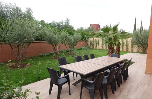 c'est un écrin de verdure avec une grande piscine dans la campagne à 30 minutes du centre de Marrakech, et 50 minutes des cascades de Ourika. ( pour manger les tagines et boire du thé les pieds dans l'eau )